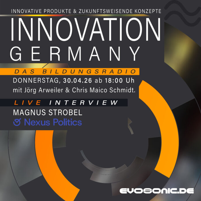 INNOVATION GERMANY LIVE auf EVOSONIC RADIO. Donnerstag, 30. April, ab 18 Uhr. Gast: Dr. Magnus Strobel von Nexus Politics