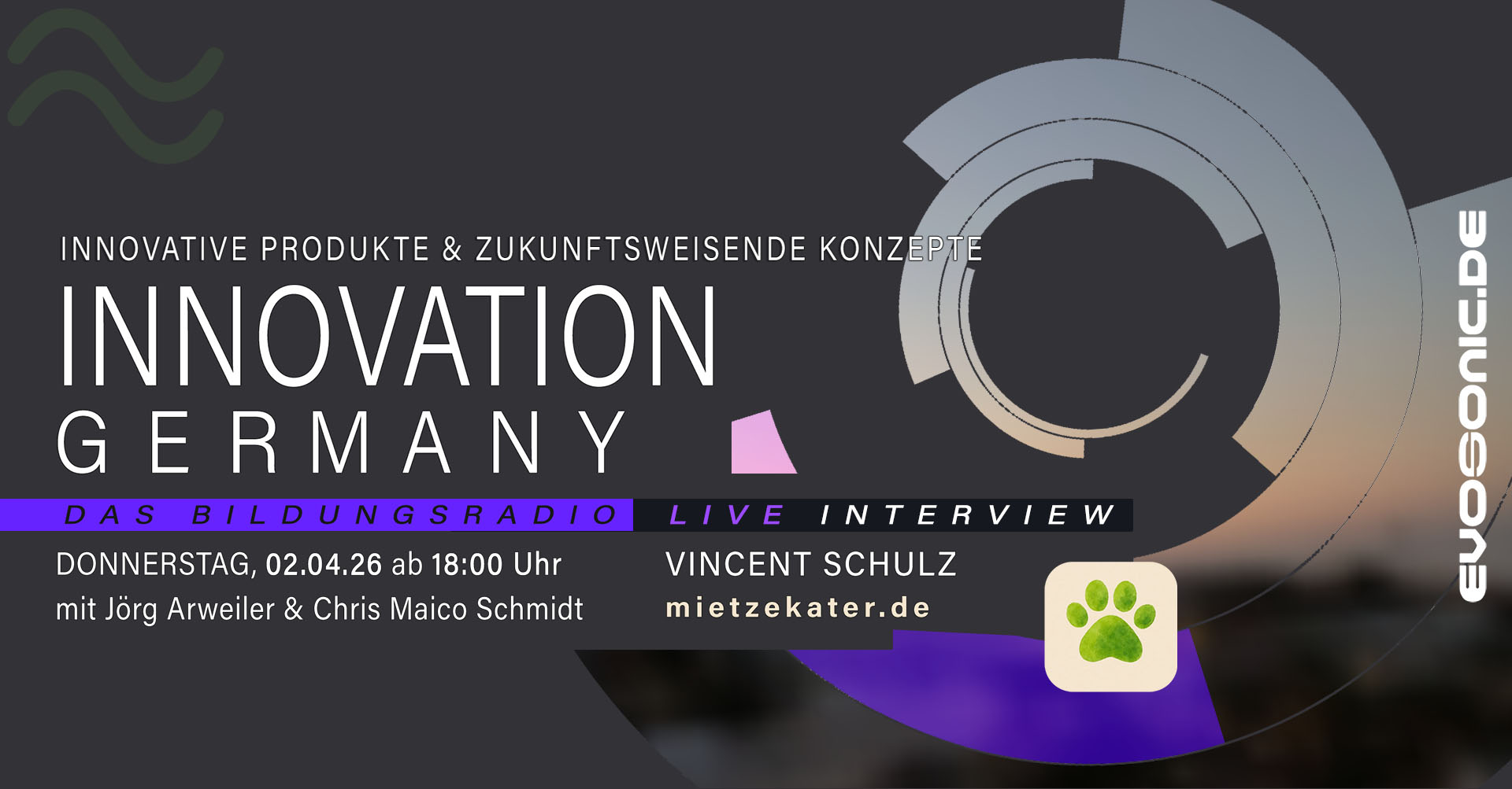 diesen Donnerstag, den 02. April, ab 18 Uhr erwartet euch eine spannende neue Ausgabe von INNOVATION GERMANY LIVE auf EVOSONIC RADIO!