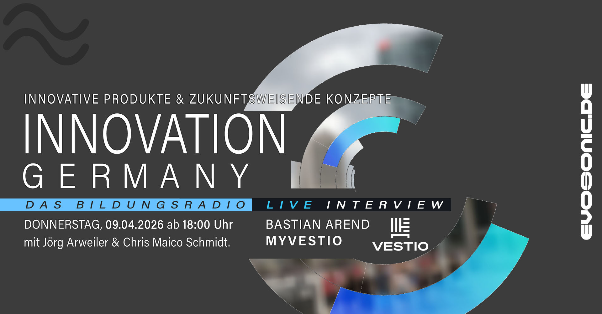 Verpasst nicht: INNOVATION GERMANY LIVE auf EVOSONIC RADIO Donnerstag, 09. April, ab 18 Uhr Gast: Bastian Arend von MyVestio.com