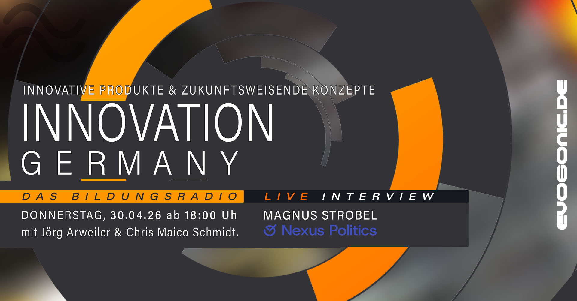 diesen **Donnerstag, den 30. April, ab 18 Uhr** erwartet euch eine spannende neue Ausgabe von **INNOVATION GERMANY LIVE auf EVOSONIC RADIO!**